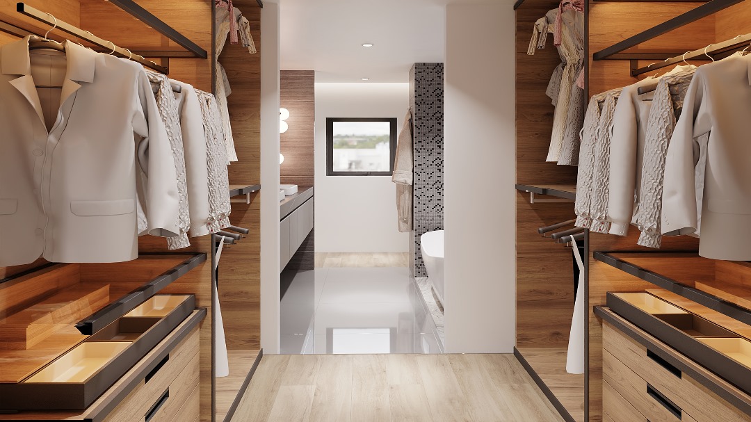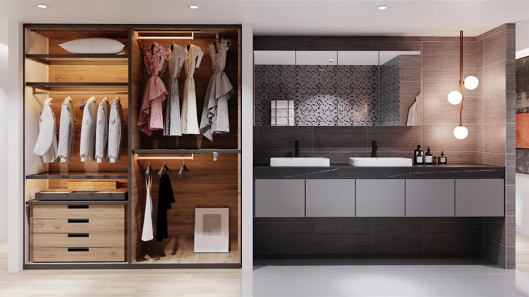 Förvaringen är smart löst med inbyggda skåp och öppna hyllor som ger en städad och avslappnad känsla. Belysningen är anpassad för olika behov, med dämpbar huvudbelysning och fokuserad ljuskällor vid spegeln.